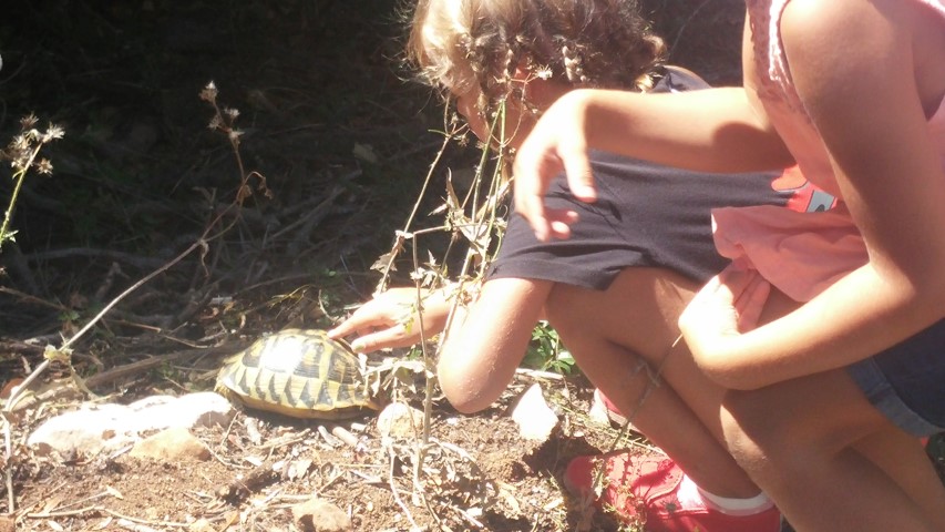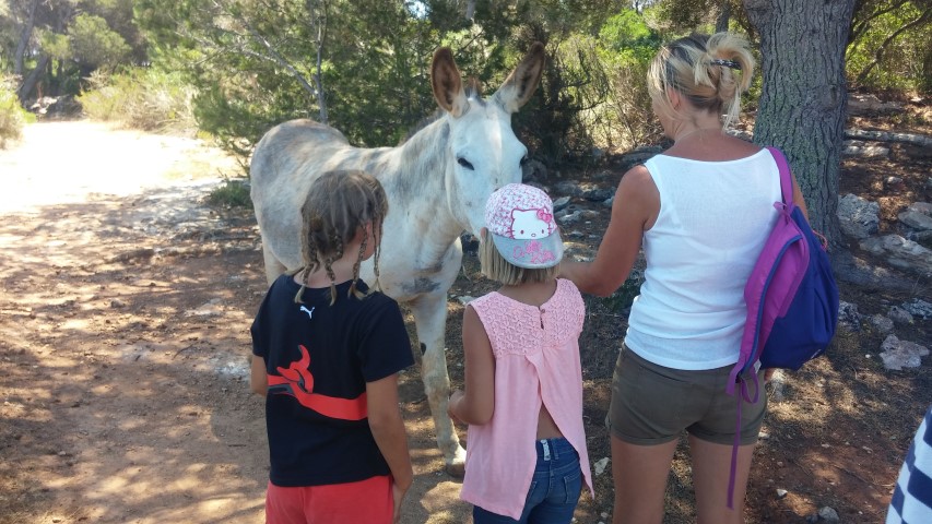 This cala was full of caves which at one time had been inhabited by humans. The girls went on a exploration of them and had a great time finding their way to them and back to the dinghy. We had a great walk to Cala Porte from here to. We saw a wild tortoise in the scrubland which was a lovely surprise. On the walk back we came across a mule which the girls promptly named snowdrop – can you guess why? He proceeded to follow us on our journey only to bellow at the top of his lungs when the path dropped into single file and steeply downwards as he was unable to follow. You could still hear his haunting calls for over half an hour afterwards, a sad and melancholy sound.