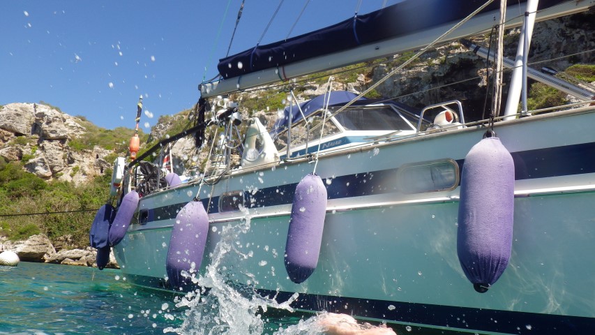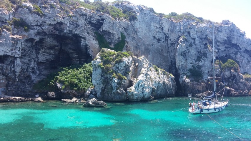 An absolutely idyllic Cala. 11 miles from Cala Galdana by sea. Here we had to do something we have never done before and that was drop anchor then back up and tie off to rocks. Rainer was there to assist us in his dinghy and took our line. The bottom was sand and rock so a bit haphazard to find good ground but the Rocna dug in very well. We put a Bruce Anchor out on a stern line as well as the line to shore. Solidly held on 3 points now.
