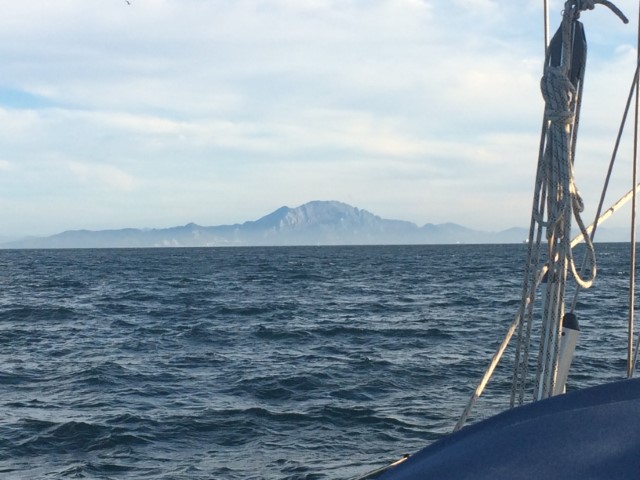 Morning arrives and we up anchor and head off to Gibraltar again. As predicted the wind picks up steadily as we approach the straits until we have a force 7 (28knts +) on our nose and a sea that is now crashing over the bow and causing the drainage holes to work hard for once. The anchor rocks in its cradle and Jessica becomes avid at ensuring it is still in place every time we burrow into the sea. We make very slow progress so decide to try to ease off a direct route and use the wind to our advantage instead. It takes us way off course but we get a much calmer ride. At least we aren’t in difficulty like a German boat ahead. He is calling a mayday saying he has engine trouble…..he has sails so not sure why it’s a mayday. I would say it’s because he came tanking passed us on route with his engine on going way over 7.5 knots, so think he is likely to be out of fuel! He gets a tow in from the salvamento boat which is going to be rather expensive, no free rides here.