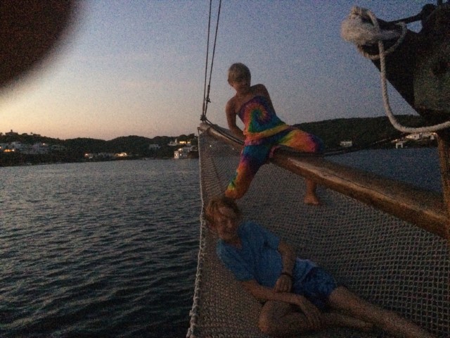 We sailed from Mallorca to Menorca to Cala en bosch where we snuck up on Grace and Sarah because Tony already new about the surprise. Grace saw Tony video three random people and it was us .They all came on board the boat .We tried to go swimming but it started to rain and there was a storm and we started to drag and they went . As they were on the beach we had an inflatable donut come past us so we caught it. yipeeeeeeeeeeeeeeeeeeeeeeeeeeeeeeeeeeeeeeeee. We didn’t get to spend much time with Grace because we had engine problems so we sailed  to mahon we tied to the quay side and we met a boy named Badger . We went shopping because we were running out of food.We went out to anchor and met two boys and a girl the boys names are Fred,Gorge, and Indie the first thing I said was do you want to be our friends? and if I hadn’t  of done that we wouldn’t have gone donuting at 47kts. The next day we left mahon and went to Sardinia.