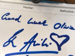 We were having a nice day in Vilisimius when Sir Ben Ainslie came into the bay and the Americas cup racers too. Daddy Jessica and myself got into the dinghy I was really exciting because I had never met anyone famous before. We followed a boat into the marina I was really scared too though. As soon as We moored up the dinghy we got more and more and more and more and more excited until we saw him we exploded. Daddy said the first words they were “can We have your autograph please” he said yes here is a picture and another photo of him flying