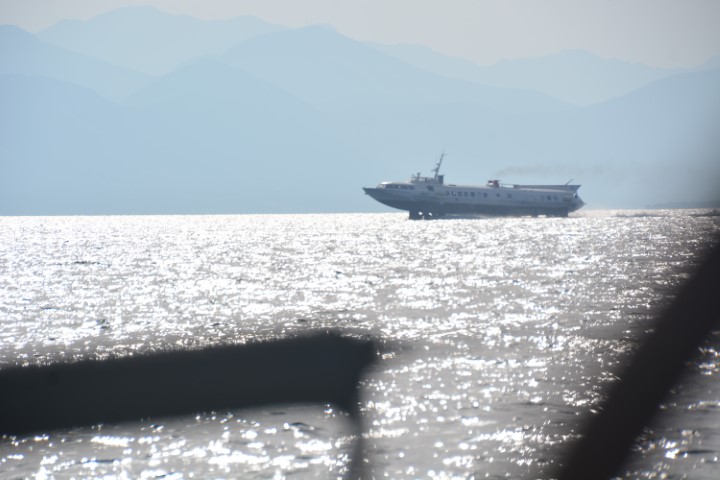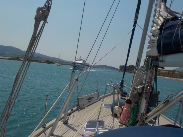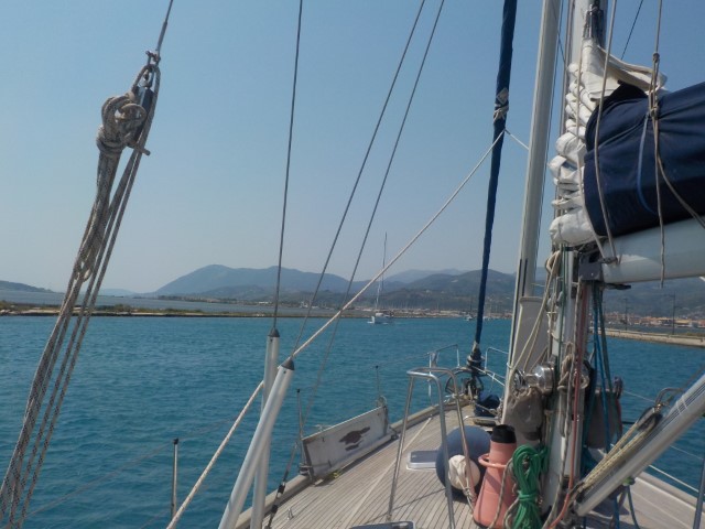 25-6-2019 – Preveza to Nidri via the Lefkas Canal. So this trip involves getting to Lefkas and waiting for a bridge to swing open to pass through a canal which is the entrance to the Southern Ionian. So we set off knowing the bridge doesn’t open for long but opens on the hour every hour. We decided that a slow sail there from Preveza should get us there approximately 15 mins early. We set the genoa and it didn’t take long before we were travelling too fast, we had to put away most of the sail and we were still doing 5 knots. Something that most days we would have been happy with if we had all the sails up. We got to the bridge 35 minutes early and the wind had got up to 30 knots, white horses everywhere. The waiting area is very small and hazardous with sandbanks all around. We decided to go back out into the sea and wait out there in very bouncy seas. When we turned to come back in at the due time, we had no sails up, the engine at 1,200 rpm (just above tick over) and we managed 6.1 knots….. we then held station for 3 minutes in a horrible sea until it opened. Keeping a boat perfectly still in 30 knots is a test. No room to move at all. I could feel the wife’s tension all the time….but it opened and through we went with Cuffysark right behind us.