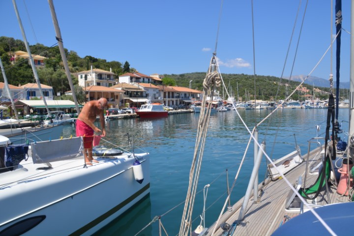 23-6-19 We left 08:20 the next morning heading for Preveza, some 51 miles away. This meant skipping the lovely islands of Paxos and anti Paxos and also the bay of Parga where you drive your boat up the beach, jump off the front to set the bow anchor in the sand. We knew the southern Islands were better protected and a little greener. The flotilla season is soon approaching where the area is flooded with many newbee’s at sailing whom charter large boats they can’t handle. That’s far from the truth but is the case in some cases. The 51 mile sail was a unique sail in respect that the wind just continually kept changing strength and direction. Cuffysark behind once was steering the exact same course as us but had all his sails out the opposite side. i.e. the wind blowing 180 degrees from the opposite side. We had no wind, then 20 + knots, then nothing, left, right, left… I must have pulled out our genoa and put it away again around 15 times (slight exaggeration). Preveza was the first time as a family we had to do stern to moorings with our anchor which is very common in this part of the world. This means someone has to drop the anchor at the front and let it out whilst at the back of the boat the crew has to be ready with two lines to tie lines ashore and once done the anchor line is then pulled in tight. In addition to the stress of all that, you also have to make sure you don’t drop your anchor someone else’s. This is a very common thing that happens. If it does it is great fun trying to get them apart…. Luckily we got in perfectly, with no incidents looking like pro’s. My crew is the best you can get.