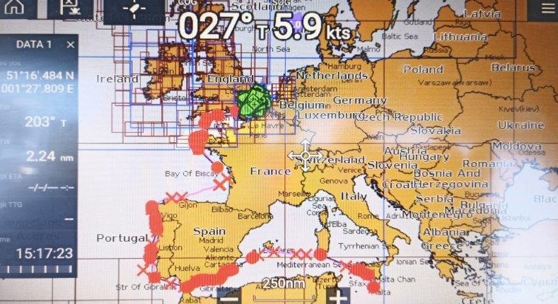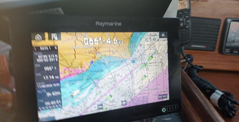 The next day as always an early start at sunrise and off we went again. The wind and sea conditions were a lot nicer than the previous day but we were still wary of the Orcas. We passed La Coruna and was pushing onwards. At around midday, Reiner called the alarm of a killer whale sighting some 100ft away and we quickly switched everything off. A tense moment with us all being silent and letting Arctic F just drift. 40 minutes of watching the sea everywhere to see if we saw it again. We were lucky, started the engine and went underway again. That day and night was kind and we hit our waypoints as planned and then started heading up as the wind came in as high as Arctic F could point. Next day the seas started getting larger and the winds stronger and the skies greyer. It was not pleasant at all, difficult to do anything. Mike still always managed to surprise us with great food. Putting socks on, drinking, going to the toilet were not easy tasks. The great news in the higher winds was Arctic was going well under wind alone 7 – 8 knots and driving herself through the waves and the engine was having a rest. We had some worrying moments when we kept looking at the large split in the mainsail it it was getting bigger. At one moment we thought we may have to stop to get it sorted/ or bring AF back on a truck due to time constraints. This was hard but the time morning came and we had made it to near La Rochelle it was decided we should just tack and head our way back across Biscay. The weather was significantly nicer and AF was still sailing albiet damaged sails. Sprits were a lot higher all round and we could feel we were breaking the back of it. We had some maintenance to do, fix some leaking windows, swap out the fridge freezer pump again etc etc. All was good but in the back of my mind was the next hurdle of getting through the Raz de Sein…..From our progress we would get there at night fall and the timing far from perfect as described by the pilot books with winds also on the nose again at around 20 knots…not ideal. My crew had no issues but I was worried. We went for it and I had need not worry. Arctic F is a heavy displacement boat that is designed to be as safe as you can get. She was thrown about a bit but pushed through the gap between rocks and a lighthouse with tide with us and wind against us. This part took about an hour to get through and then headed onwards into the night. We had as a team looked at the weather and still on the nose against us and but we were going to keep on going. Later that evening I looked at our fuel levels and made a decision to head for Camaret Su Mer to refuel before heading for Roscoff. We arrived early hours of the morning and dropped anchor. We were to catch only a few hours of sleep then awake get fuel and set straight back off again. Once up we headed for the fuel pumps only to find out they had been damaged and were out of order. Luckily the local fisherman pointed to the old fishing port were we could get diesel from an automated pump. With Arctic’s tank full (550 litres) it felt good to get going again. This should and did get us all the way home. The weather was good and we turned the final corner and was now in the English channel, next stop – Roscoff. One issue we had to face on the route was the best place to sign out of Europe. It was very important to do this as you can be fined especially if you over stay your 90 days allowance. AF had been to Roscoff before and there was a shortcut down a narrow channel which saved an hour on the journey but is fun to navigate…..we decided to take it (me being more nervous, my crew were a rock and helped me make the right decisions when I was doubtful, it pushed me and I am grateful for that) but it was a good decision as it’s very scenic. It’s like boating on the broads…. with more accuracy on the steering. Its only about 1 – 2 miles along but the chart plotter had about 10 – 15 waypoints to make sure we were safe. Roscoff is a ferry terminal and the marina is nice and modern. It was great getting in there knowing that when we leave the following day we were heading for England. We had to make arrangements to go to the ferry port when the next ferry was due in to get our passports stamped. This went well early the next morning so we were good to go. The weather was still wind on the nose to go towards our target so sailing straight across the wind to head 90 degrees to England and then just push towards Dover and Ipswich using the motor. I kept my fingers crossed so that we could get to Ipswich before Jessies Birthday. It was good day to cross but the English channel is really busy with boats coming from everywhere. The VHF radio was chattering all the time. The lovely sound of the British accent from a female operator at the UK coast guard was great to hear. There seemed to be many Maydays and Pan Pan’s from both France and UK. It kept us on our toes. We did have to call up a NATO warship and ask if he could change course even though they was in convoy to which they obliged. Mike enjoyed wishing them onwards safe passage. It took the whole day to get through the thick of all the traffic. The shipping ranging from very very large container ships to fishing boats dredging. On my watch we even had the Queen Victoria pass within a mile of us running on a similar course. As night approached we started the heading up towards the Solent. We had put up our Q flag to signal that we were coming from abroad. We have to notify 12 miles out the coast guard by phone call/email. This is great in theory but its impossible to get a signal that far out to sea. We deliberately kept just outside the 12 mile zone so we could travel towards home without problems. The tides and currents now play a big part of your progress once in the Channel so sometimes you are lucky if we could make 2 knots and other time you could be going 8. Its a bit harder if on your watch you can only manage 2…. It did become 