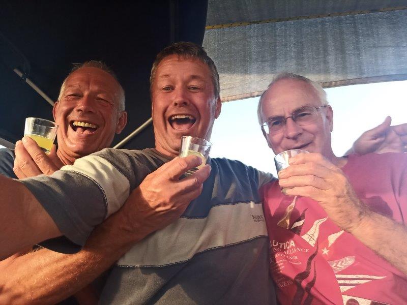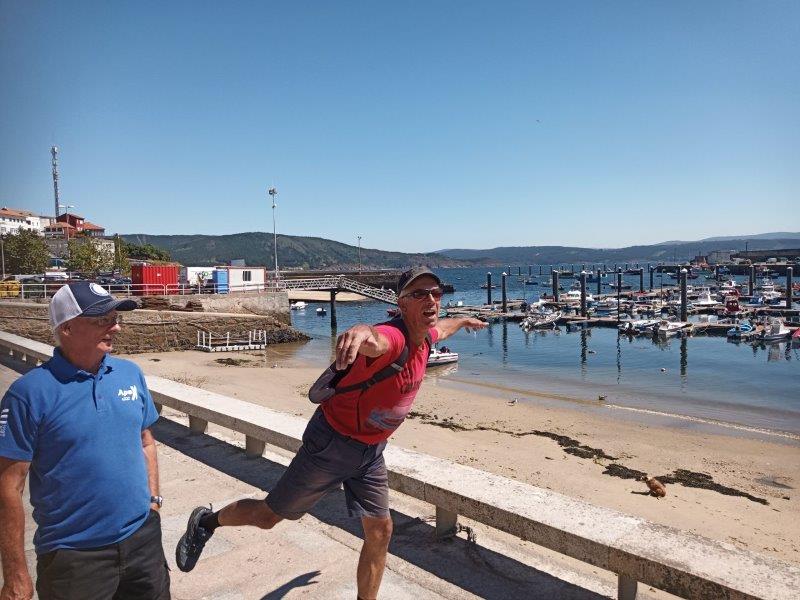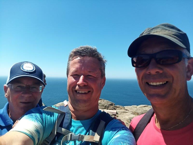 We didn’t arrive at Finnestere until late and as we got there the seas and wind got stronger and bigger. We had planned to keep going but we couldn’t motor into this sea and was under sail. Sailing close hauled, which means the boat healing at quite an angle and pushing her hard so she can power through the seas was the plan. The wind was getting up to 30 knots and the spray and water over the front was a lot. The boat speed had increased but not in the right direction. We would have to do that zig zag thing called tacking which is not very efficient. New rips had appeared in the sail and the baby stay (one of the wires that holds the mast safe) now had 7 wires broke and was unwinding. We could of carried on but I got worried and asked if we could could head for shelter behind the Finnestere lighthouse. The only problem that we all knew is the forecast for the next few days was not going to be any different. We went to anchor and all decided as the next day was going to be worse to take the day off. Reiner wanted to treat us all to a trip up to the lighthouse which was excellent. We took the taxi up and walked back down. Really nice. Back to the boat where I was hauled up the mast to make temporary repairs to the baby stay to stop the wires unfolding any more. The day was ended by the other 2 taking a dip in a very cold sea. Usual evening drinks were also enjoyed if we were not sailing. At this point I would like to point out that it didn’t matter what conditions we were in Mike always ensure we ate very well. He always ensured he did something special with every meal and it was always greatly appreciated. Sometimes when very rough he would be hanging in the galley at some really awkward angle, held in by cloths designed to support him. Sometimes a few words were said when food went every where but he was amazing. I’ll also mention a few words about my other good friend Reiner. He was so in tune with everything on the boat, the rigging, the engine, the sails, the navigation and watching and reading the weather forecasts. His ability to tune Arctic Fern was significantly better than my skills. If he saw any part of any sail that wasn’t giving 110% he would adjust it. A true asset. Our personalities were perfectly aligned and kept for a good team. By the way I was the only one with fear and caution. The other 2 were rocks and 100% confidence in the trip which helped me a lot.