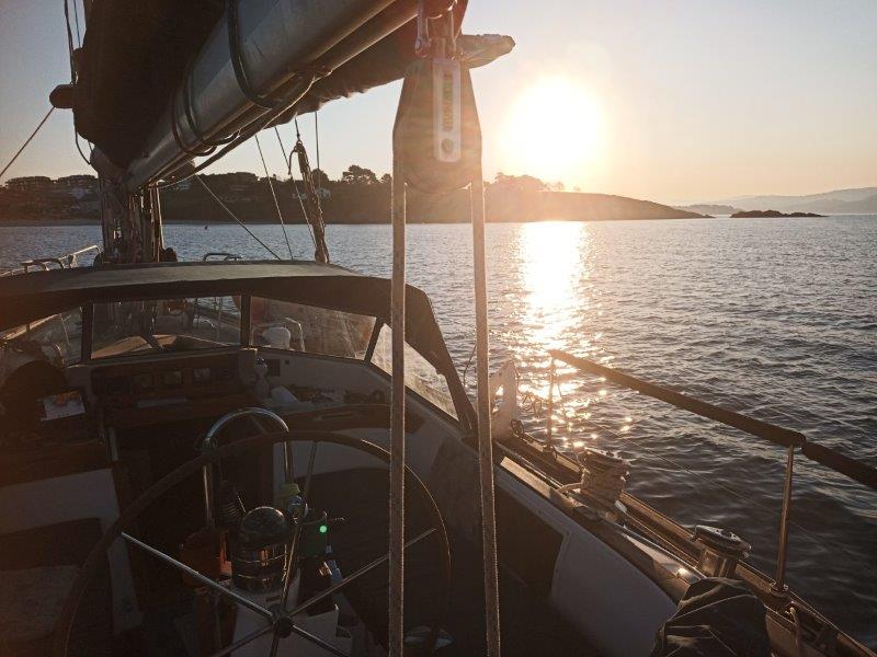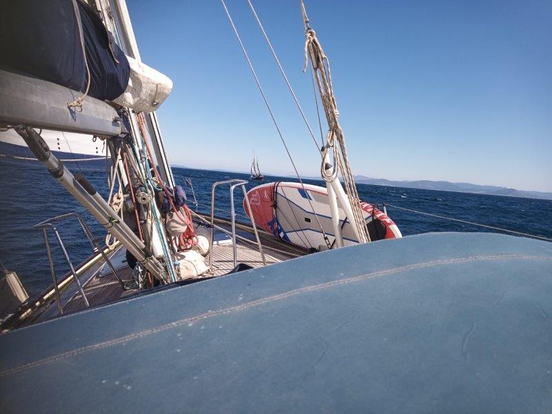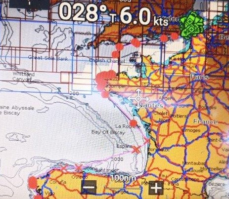 When back in the cockpit later that evening we decided to see if we could anchor behind what can only be described as a large rock. The wind was still strong but hopefully there would be some protection. The pilot book said there was only one small piece of sand to drop the anchor in and luckily we found it before sunset. We were protected more than I thought we would be although the rock wasn’t that high in places. We all slept well and set early alarms for the next day. That was a scary day and we were now round the top ready for the Biscay crossing. Since my new crew joined we kept watching Biscays weather to see if there was a good weather window. Still there was no break for a direct crossing. You need at least 3 days to cross at it was strong and on the nose for at least 7 days ahead. Most boats would wait at La Coruna just ahead but there seemed little point waiting there for a week with no prospect for the weather to change. So plan B was to sail along the South coast of Biscay and when the wind changed we could use the wind and sail as high as we could hoping for hitting the eastern side of Biscay around La Rochelle and then tack (turn through the wind) to then head for the Raz de Sein. This doubles the distance of an already long crossing.